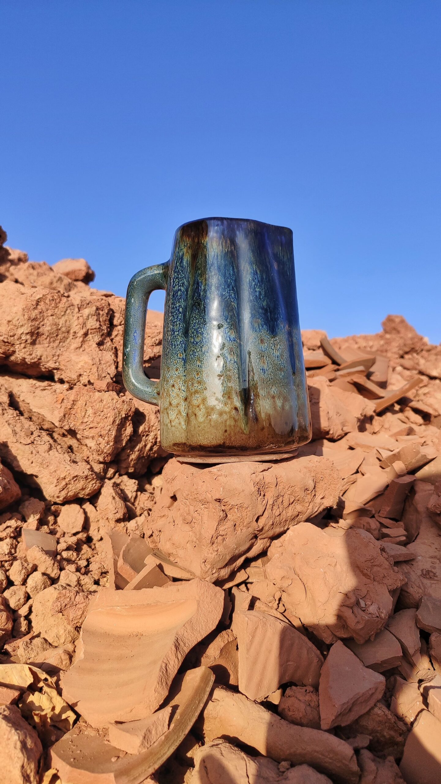 Son bleu profond, presque cosmique, capte la lumière et la renvoie en éclats changeants, comme un ciel nocturne où chaque gorgée devient une constellation.