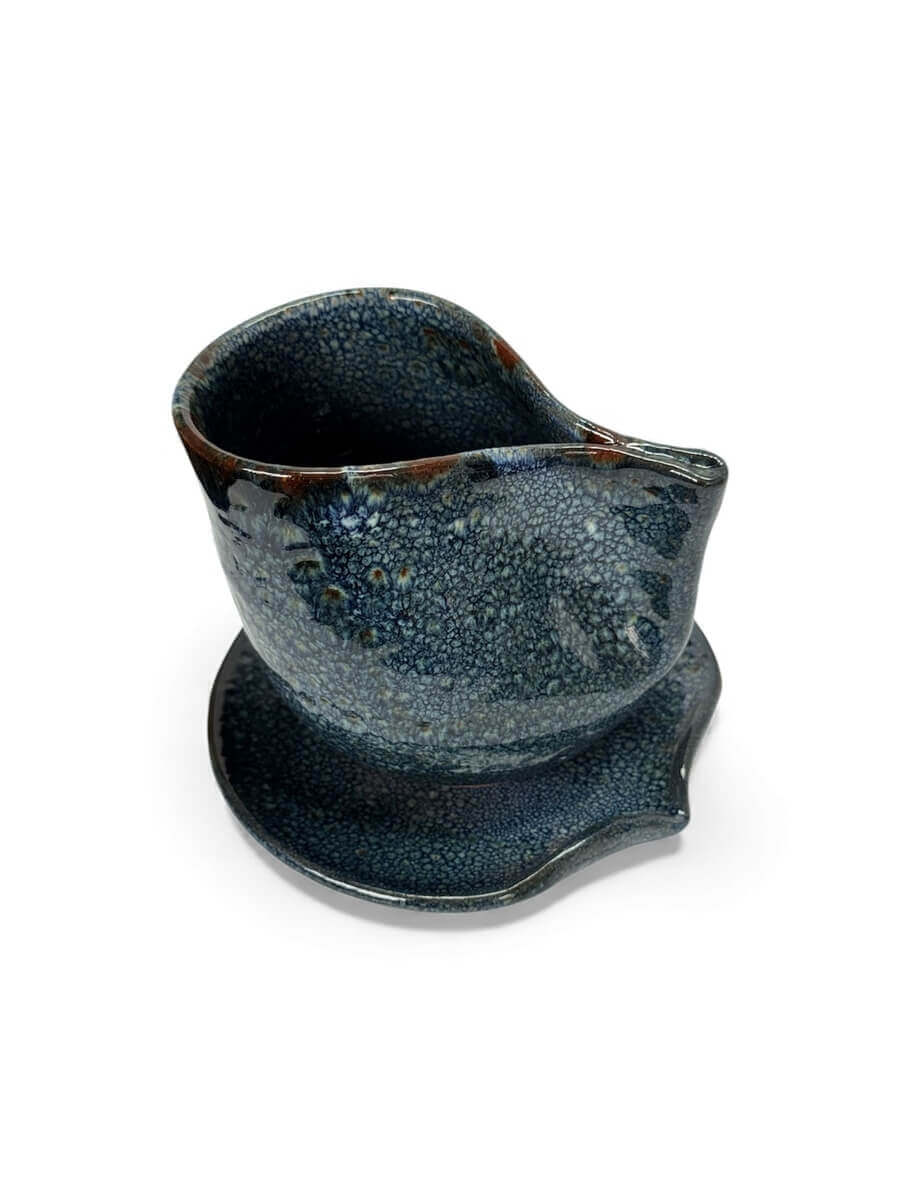 La tasse, inspirée de la silhouette d’un oiseau en plein envol, se pare d’un bleu profond qui convoque à la fois l’océan et le ciel infini. Un contraste saisissant entre la légèreté de la forme et l’intensité de la couleur.