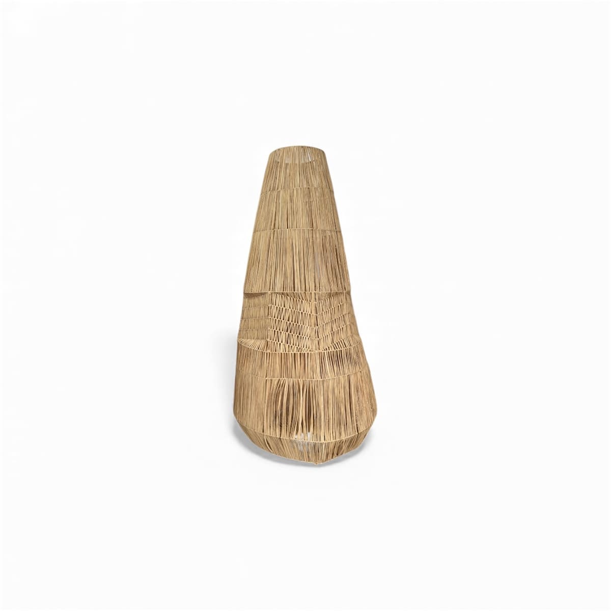 Son nom évoque l’arbre mastic, qui offrait autrefois une résine sacrée aux vertus médicinales et mystiques. Une promesse de guérison, de purification, d’apaisement. Ici, la résine devient lumière, filtrée à travers un corps d’1m60 de raphia sculpté comme une ogive – protectrice et provocatrice à la fois.
