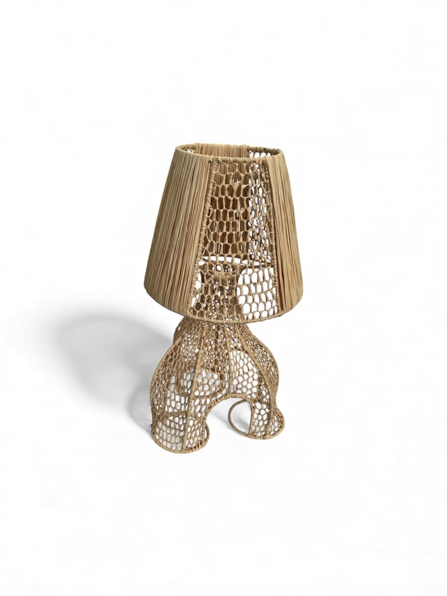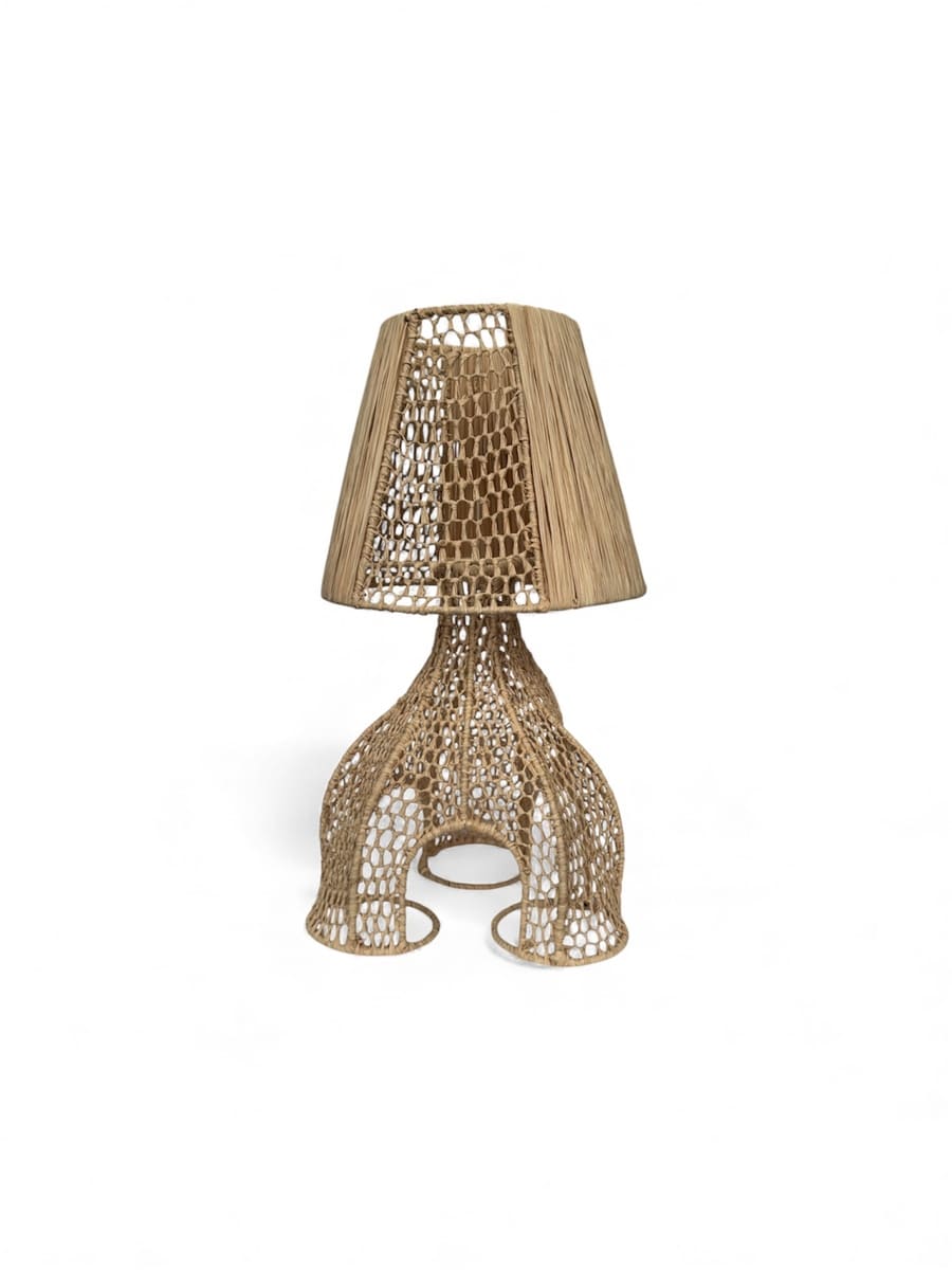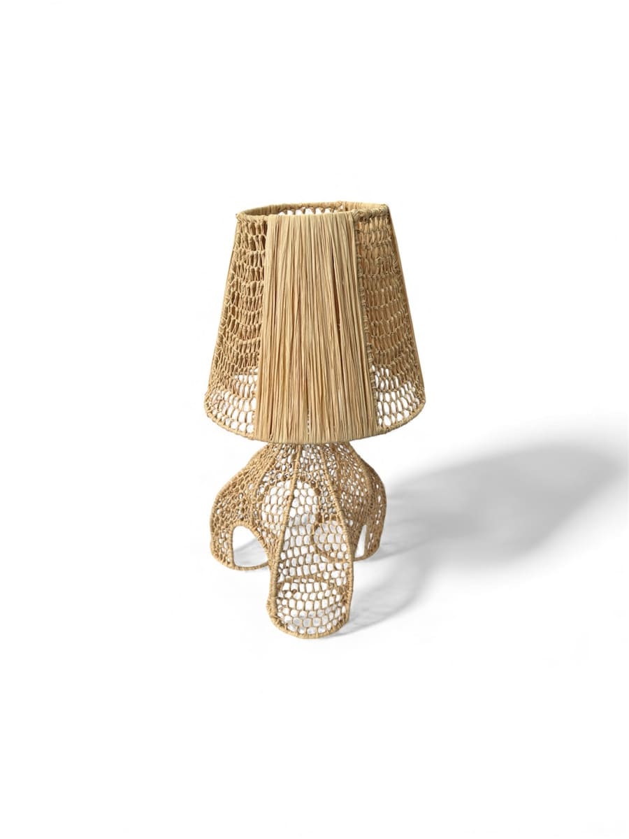 Ombrelle n’a rien d’une lampe sage. Son pied en raphia tressé façon dentelle et son abat-jour semi-ajouré créent une lumière mi-cachée, mi-révélée. Un clair-obscur sensuel, assez sage pour adoucir une chambre, assez farouche pour électriser l’ambiance.
