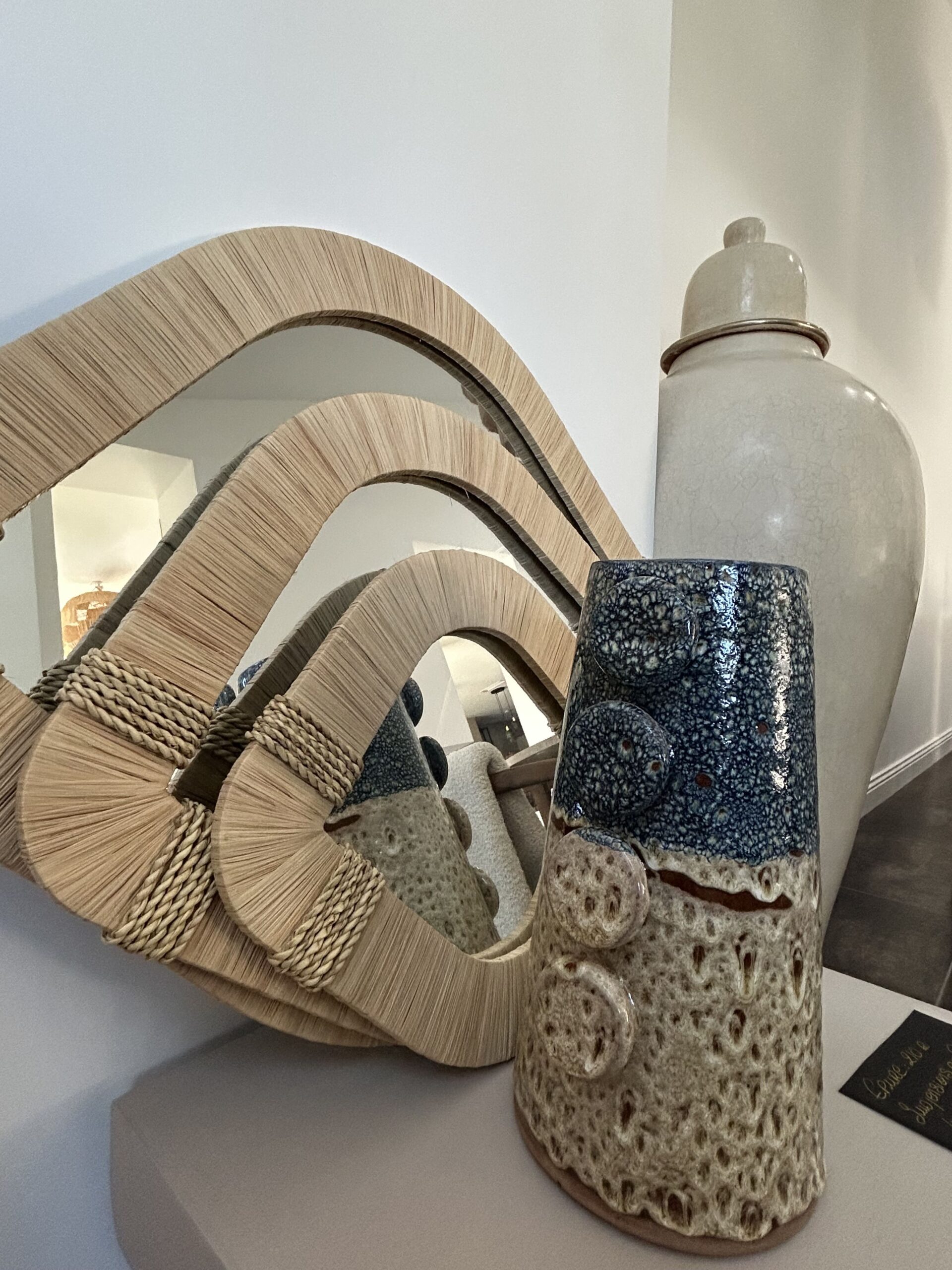 Un œil solaire entouré de raphia naturel, 100 % fait main, qui vous renvoie votre reflet… et un peu plus.