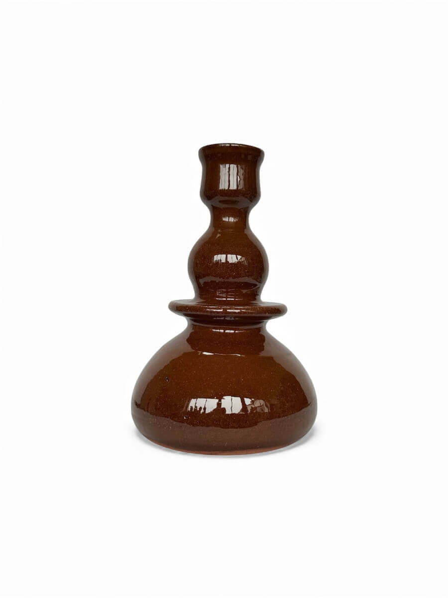 Modelé à la main, ce bougeoir en céramique brun profond possède une finition brillante qui accroche la lumière et la renvoie comme une braise vivante.