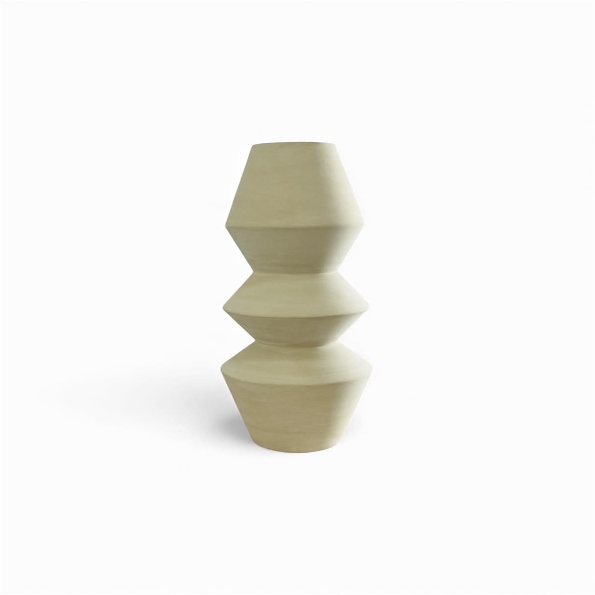La teinte grège légèrement teintée de vert, inspirée des lichens, crée un contraste délicat avec la rigueur géométrique du vase.