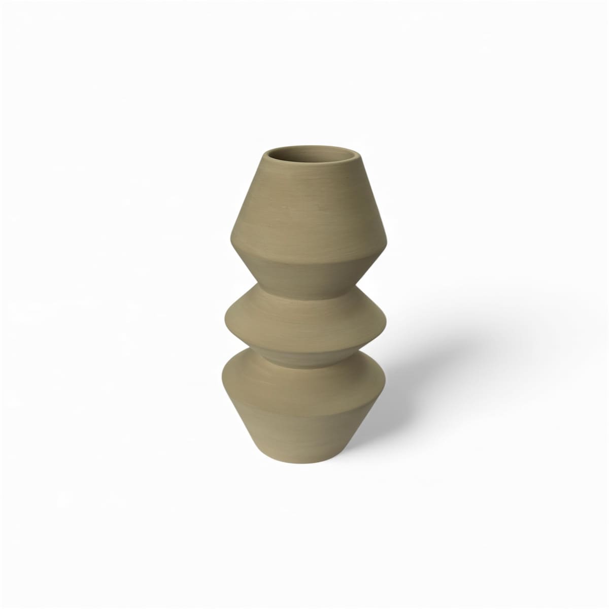Vase géométrique artisanal en teinte Sable Shiitake, beige minéral aux accents organiques.